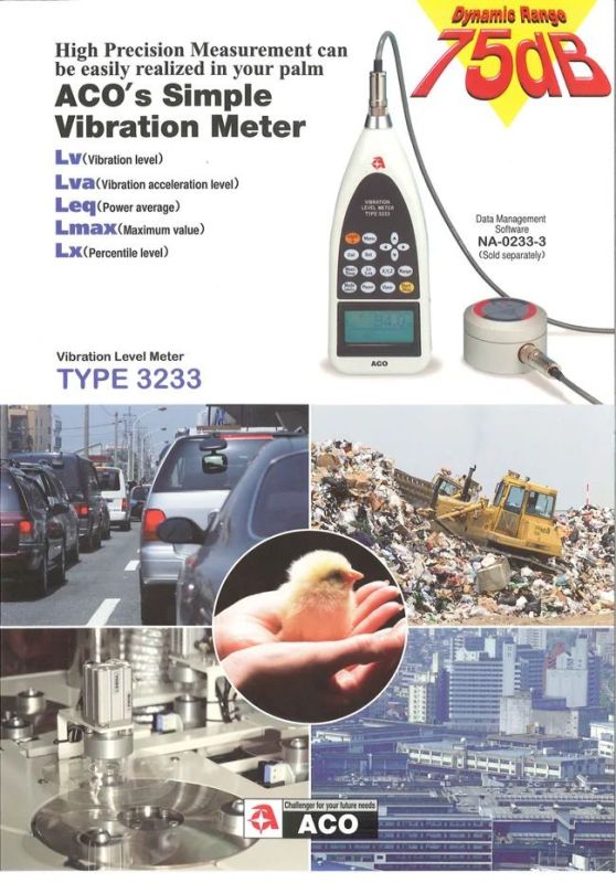 Type 3223 conforms to measurement law JIS C 1510-1995, and exerts mobility at every measuring site because of its small size and light weight. Combination/integration with Vibration Pickup Type 7833 allows you to measure vibration levels on the floor and vibration acceleration levels on the ground, floor, foundation, and seat, etc., simultaneously in three directions: X, Y, and Z. The measuring and computing items are: vibration level Lv (with sensory characteristics taken into account), vibration acceleration level Lva (of physical quantity), power average Leq, maximum value Lmax, minimum value Lmin, and percentile level Lx, of which instantaneous values are digitally displayed on the liquid crystal screen. These can be simultaneously recorded on an external level recorder with output terminals independent in three directions. In addition, data processing has been simplified by integrating with peripherals using I/O terminal (RS-232C interface). ACO's Sound Meters, Types 6224/6226, having equivalent specifications, are also on sale as popular comparison meters. Please make use of these in combination with the measuring instruments for environment control.