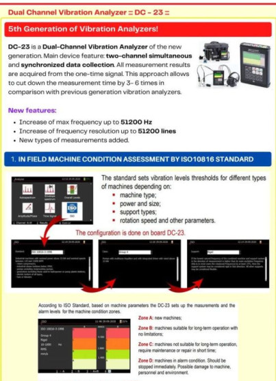DC-23 is a dual-channel vibration analyzer of the new generation.Main device feature – two-channel simultaneous and synchronized data collection. All measurement results are acquired from a single time signal.This approach allows cutting down the measurement time by 3–6 times in comparison with previous-generation vibration analyzers.